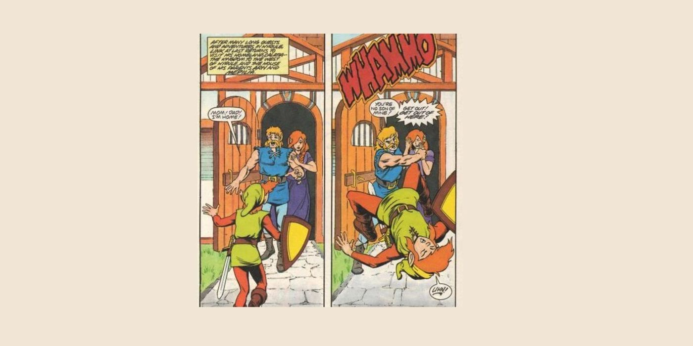 Link tiene la desgracia de empezar el número 5 recibiendo un rápido golpe en la cara, siendo el portador de dicho golpe nadie más que su propio padre. Antes de eso, Link estaba muy contento de conocer a sus padres, Arn y Medilia, en Calatia. Pero entonces sus padres le abrieron la puerta a Link, su padre le pegó, y luego lo echó proclamando que no era su hijo.