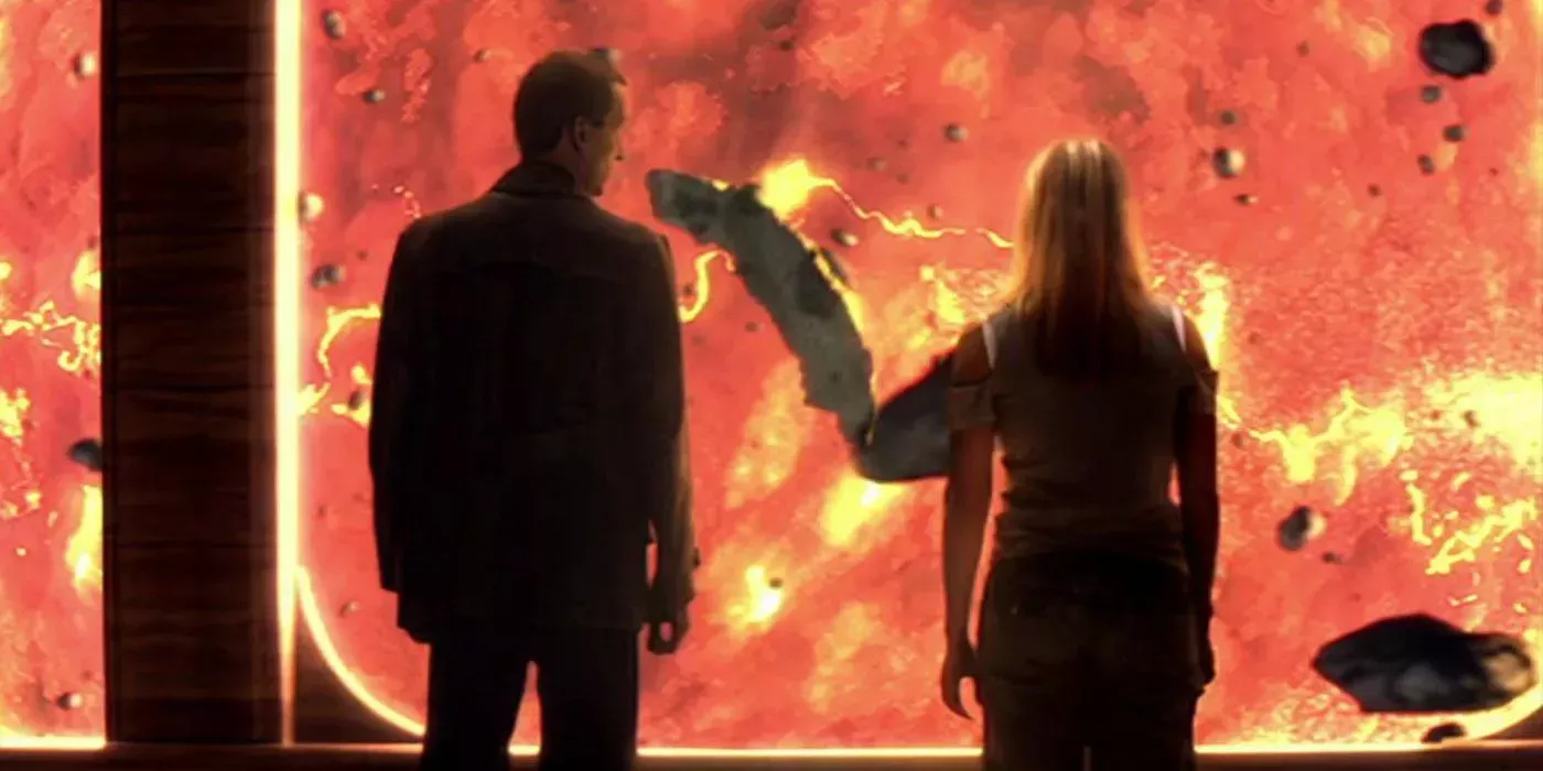 La etapa de Christopher Eccleston como el Noveno Doctor fue importante para reintroducir al personaje, pero su temprana marcha también ayudó a salvar Doctor Who"The End of the World" seguía al Doctor y a Rose en su viaje de cinco millones de años al futuro, donde el Doctor esperaba mostrar a Rose el fin de la Tierra desde la protección de la Plataforma Uno. La estación espacial albergaba una gran variedad de especies alienígenas de todo el universo, todas ellas reunidas para observar la desaparición del planeta.