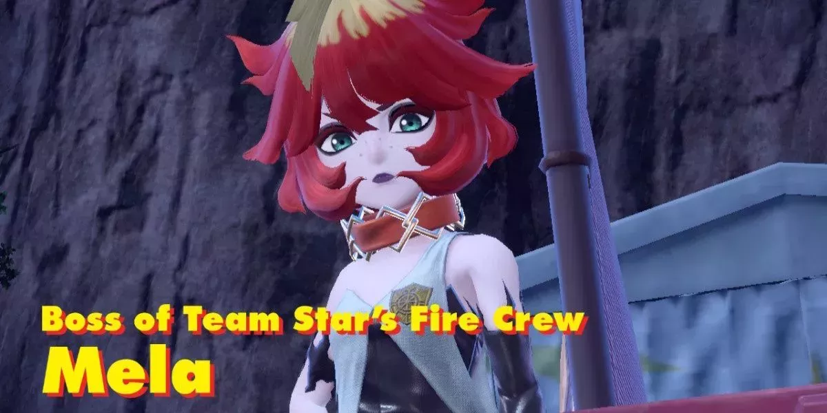 Mela es el jefe de tipo Fuego del Escuadrón Schedar de Team Star y el segundo en cuanto a niveles y supuesta dificultad. Sin embargo, el espíritu ardiente de Mela puede castigar instantáneamente a los retadores complacientes, lo que significa que hay que acabar con su Torkoal y su Starmobile lo antes posible.