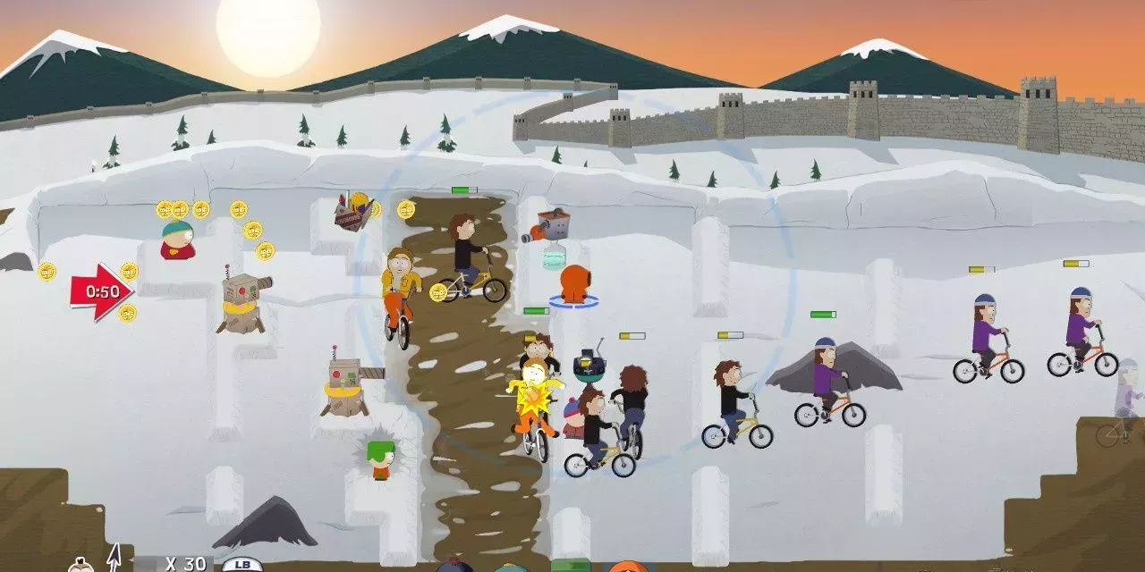 South Park experimentó con algunos lanzamientos menos sustanciosos para Xbox Live Arcade, siendo South Park Let's Go Tower Defense Play! de 2009 el primero. Let's Go Tower Defense Play ! llega en el momento perfecto en el que los títulos de defensa de torres estaban en la cima de su popularidad. También había habido una considerable sequía de contenidos de juegos de South Park .