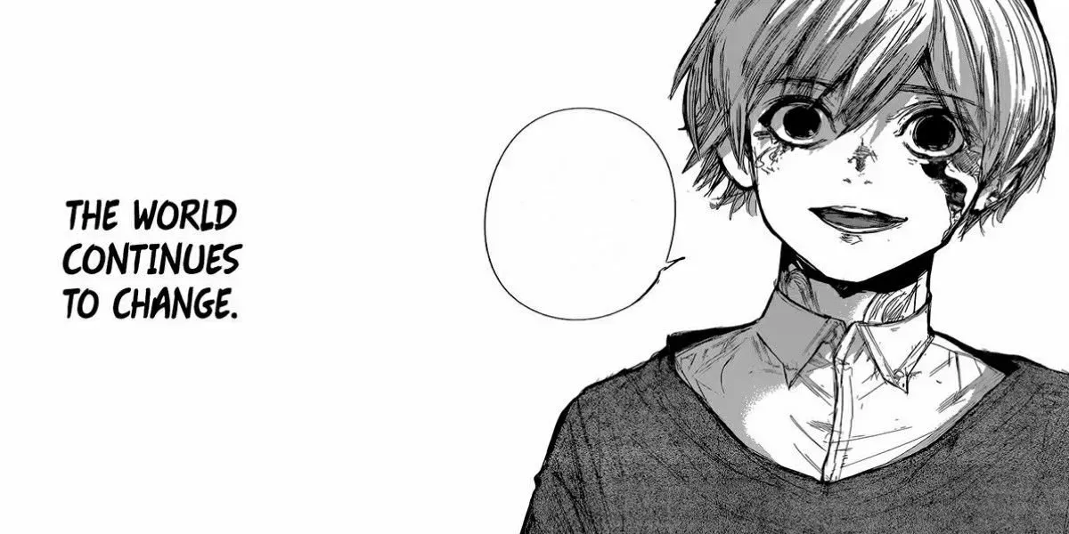 Sin embargo, hacia el final, la línea de pensamiento de Kaneki evoluciona hasta un punto en el que se da cuenta de que cada uno es el protagonista de su propio viaje. Todos roban y protegen en su propio beneficio. El mundo no es lo que está mal; simplemente es. A fin de cuentas, si pudiera elegir, seguiría optando por esforzarse como siempre lo ha hecho, pase lo que pase.