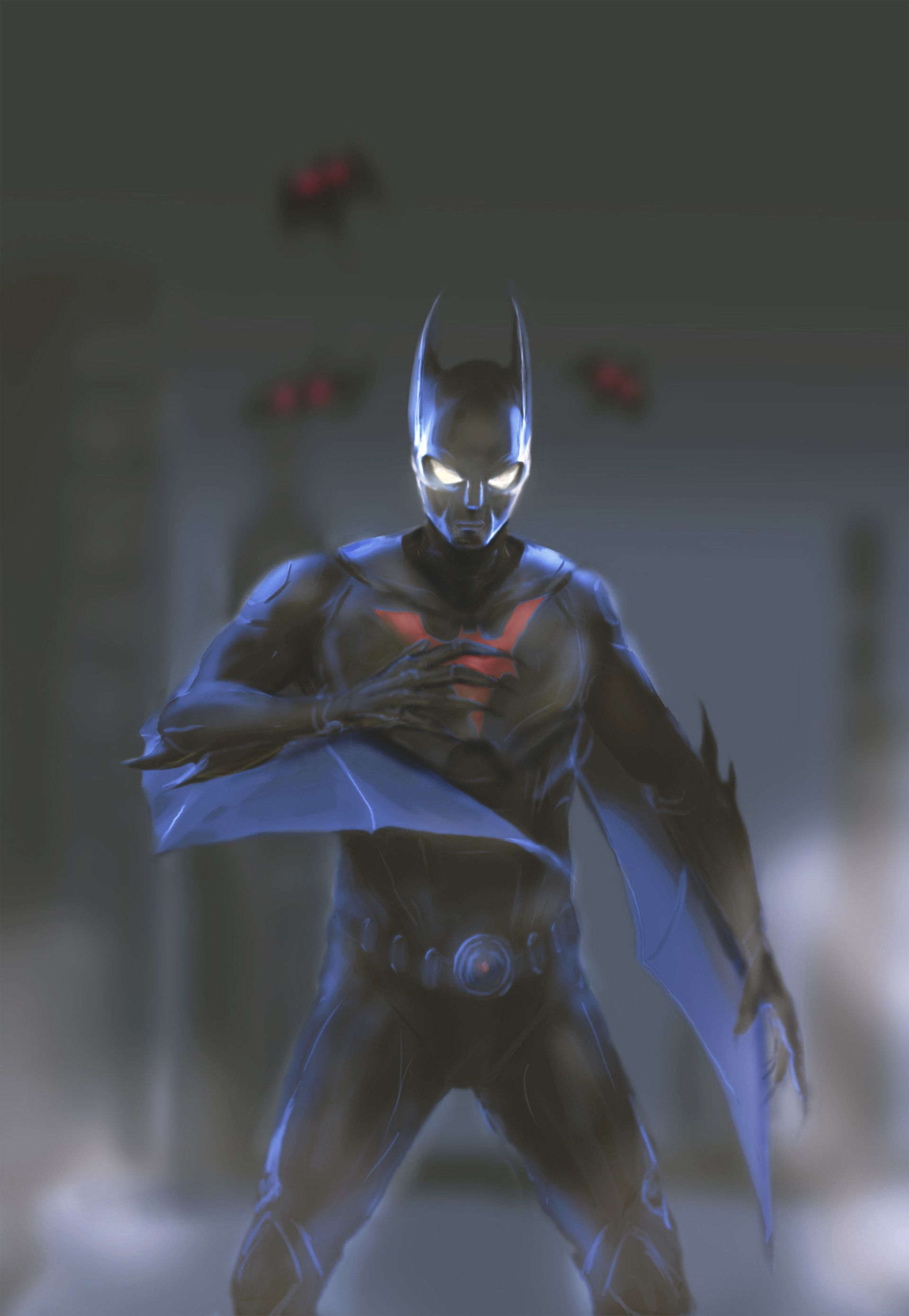 En la serie, sus alas eran sólo una parte de su traje, pero el aspecto holográfico lo hace más adecuado para el escenario futurista y la tecnología por la que Batman es conocido. Está en la cima de una alta torre que vigila Ciudad Gótica, con toneladas de coches voladores debajo.