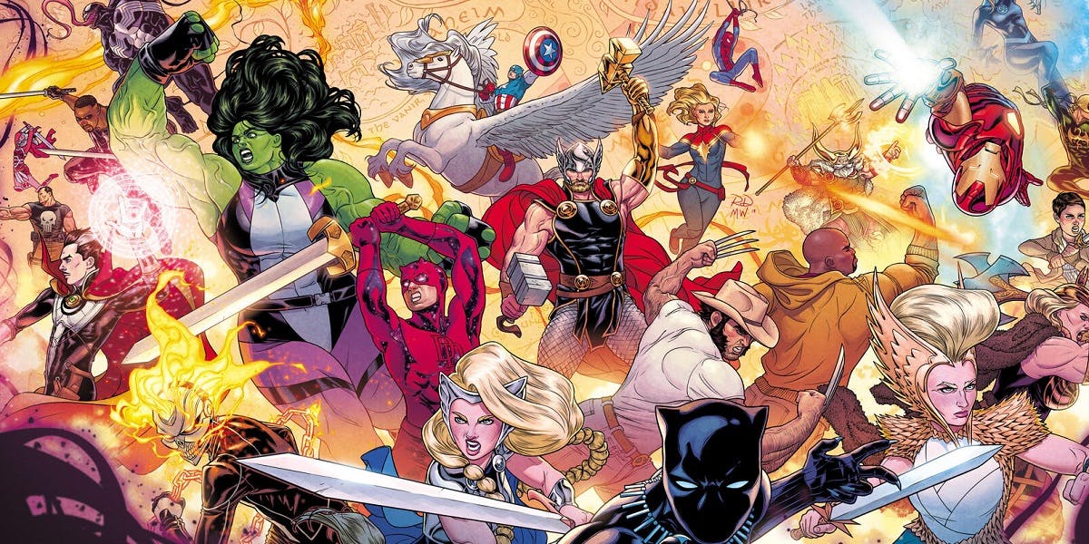 El Doctor Doom es un Dios, Thor lidera el Cuerpo Thor (una variedad de todos los diferentes Thors, ¡incluyendo un jabalí!), y el Doctor Strange como sheriff, aunque Doom termina matándolo. Más mueren, incluyendo a Cíclope. Es un evento magnífico, con algunas obras de arte impresionantes y combates de ensueño junto a un montón de combates entre un enorme elenco de héroes y villanos.