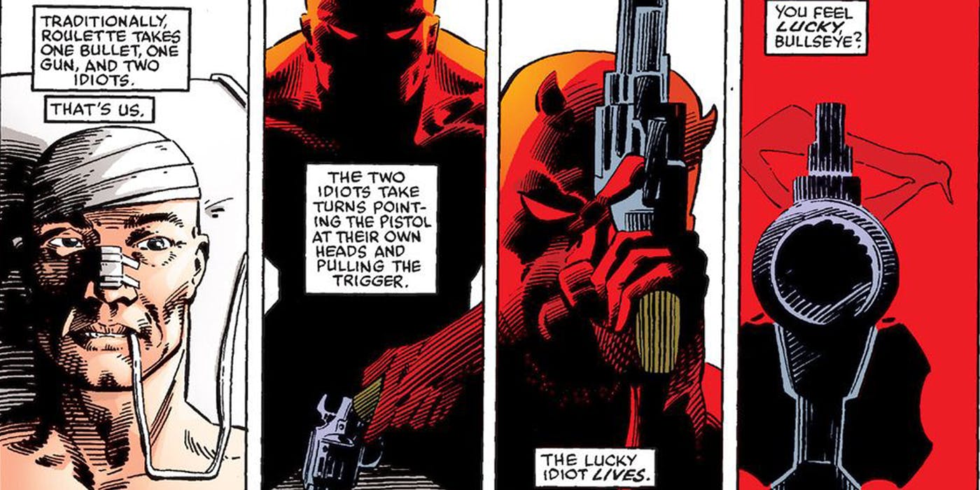 Aunque Daredevil tiene un código moral estricto, su fe en tales reglas ha sido probada muchas veces a lo largo de su carrera. En uno de estos casos, después de enviar a Bullseye al hospital, Daredevil decide visitar al detestable asesino. A su llegada, Daredevil saca un arma y juega a la ruleta rusa con su enemigo.