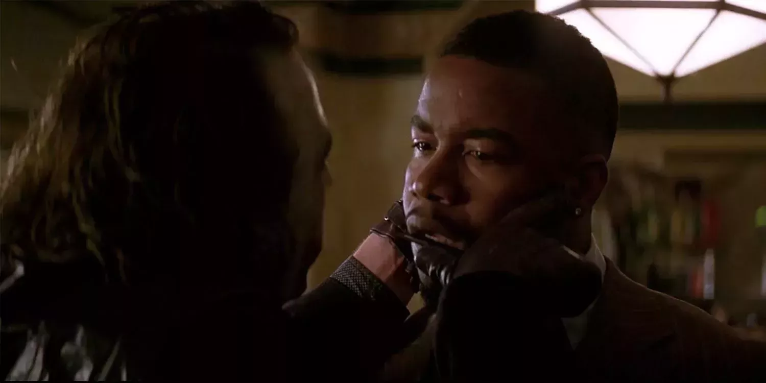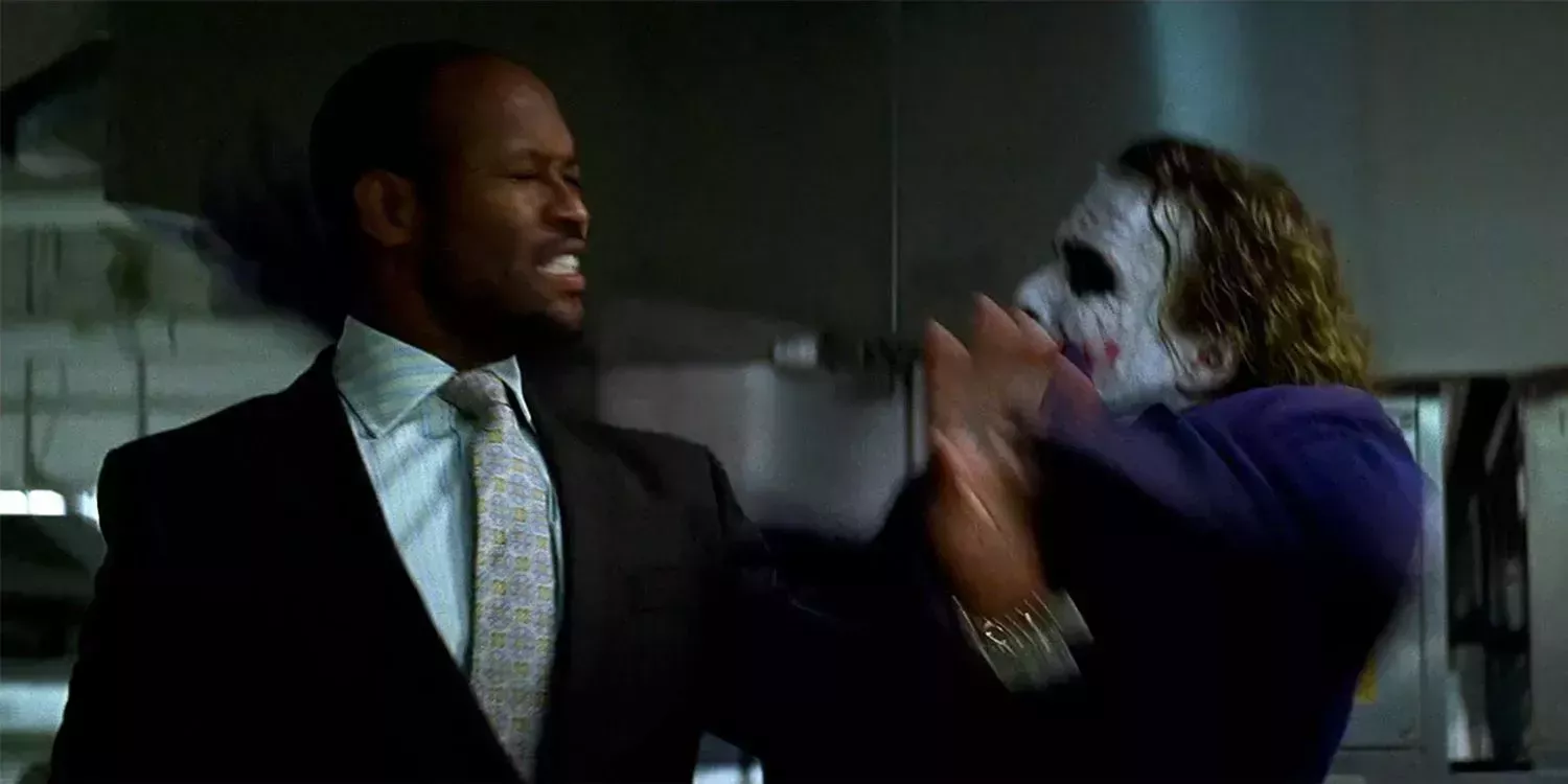 El gerente del Banco Nacional de Gotham, Ewan Yafrenzaded, interpretado por William Fichtner, llama por teléfono a sus jefes antes de recibir unas cuantas balas. El Joker le clava una granada de humo en la boca antes de mostrar su rostro lleno de cicatrices. El director del banco de la mafia queda indefenso en el frío suelo.