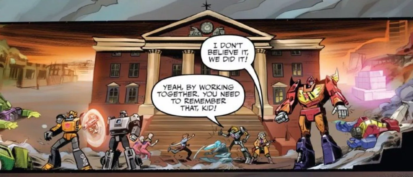 Con los Decepticons abatidos, por fin hay un momento para respirar tranquilos antes de comenzar el esfuerzo de limpiar los daños causados mientras se trabaja para reparar también la línea de tiempo. Como es lógico, los héroes se apresuran a celebrar su victoria juntos frente al famoso Ayuntamiento de Hill Valley antes de ponerse a trabajar. El lugar icónico de su victoria es más que apropiado, especialmente con Gigawatt de pie, orgulloso, debajo de la misma torre del reloj que originalmente lo cargó a capacidad en la película de 1985.