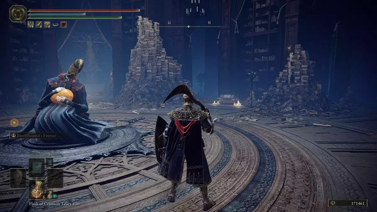 Técnicamente no tienes que haber completado la Academia de Raya Lucaria antes de llegar a este punto, pero si aún no lo has hecho, tendrás que hacerlo ahora. Una vez que todo esté listo, dirígete al lugar de gracia de la Gran Biblioteca de Raya Lucaria. Esto se desbloquea después de derrotar a Rennala, y es un lugar al que probablemente volverás cada vez que quieras cambiar.