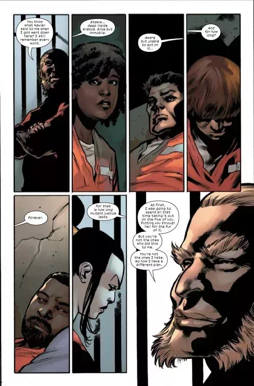 El Profesor Xavier y Magneto acuerdan trasladar a todos a la PenitenciarĂa Estatal de Krakoa cuando las cosas van de mal en peor, dándoles a todos la oportunidad de tomarse un respiro. Oya empieza a preguntarse cuánto tiempo van a estar todos atrapados allĂ, lo que provoca que Dientes de Sable les diga la brutal verdad sobre el hecho de estar encarcelados por los X-Men. "Eres demasiado inocente para este lugar, niña", le dice. "Pero la inocencia no te salvará del encarcelamiento. ÂżSabes lo que me dijo Xavier cuando me enviaron aquĂ? TodavĂa recuerdo cada palabra. Statis... en lo profundo de Krakoa. Vivo pero inmĂłvil. Consciente pero incapaz de actuar... ÂżY por cuánto tiempo? Para siempre".