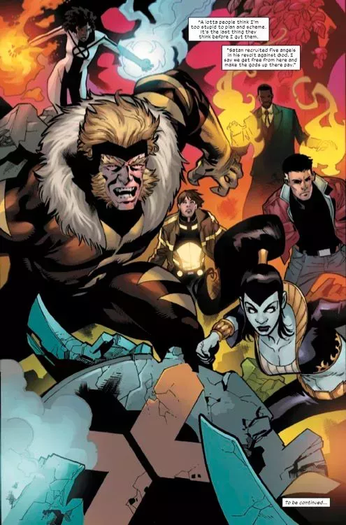 Dientes de Sable continúa diciendo a sus compañeros de celda que, aunque en un principio pensaba pasar el resto de la eternidad atormentándolos a los cinco, ahora se le ha ocurrido una solución mejor: utilizarlos para la guerra. "Mucha gente cree que soy demasiado estúpido para planear y maquinar", comenta el villano. "Es lo último que piensan antes de que los destripe. Satanás reclutó a cinco ángeles en su revuelta contra Dios. Yo digo que nos liberemos de aquà y hagamos pagar a los dioses de allá arriba".