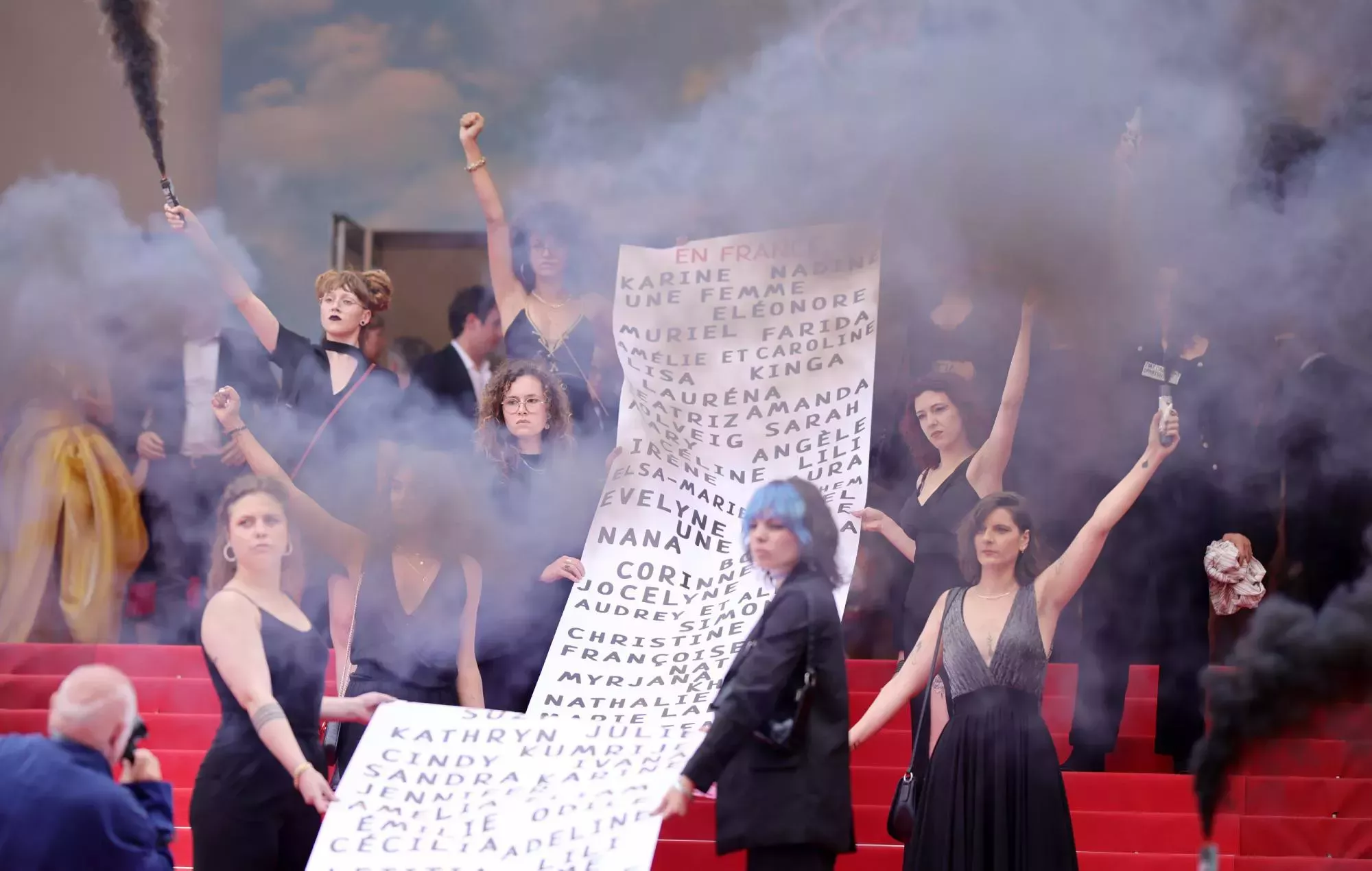 La Agencia France-Presse informa de que Les Colleuses están detrás de la protesta en la que unas 12 mujeres hicieron estallar granadas de humo negro en las escaleras frente al Palais des Festivals antes de la proyección de Holy Spider ayer (22 de mayo).