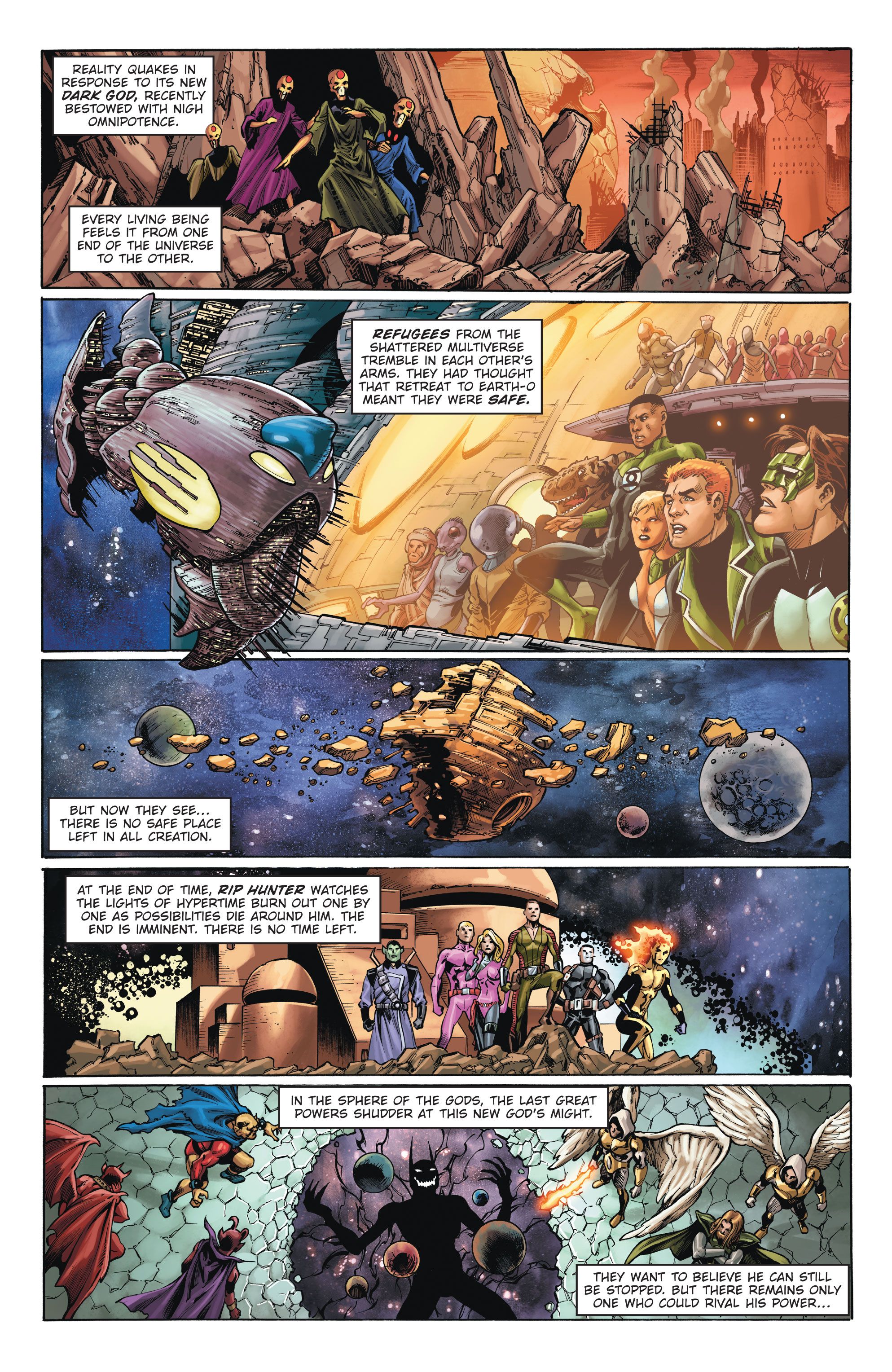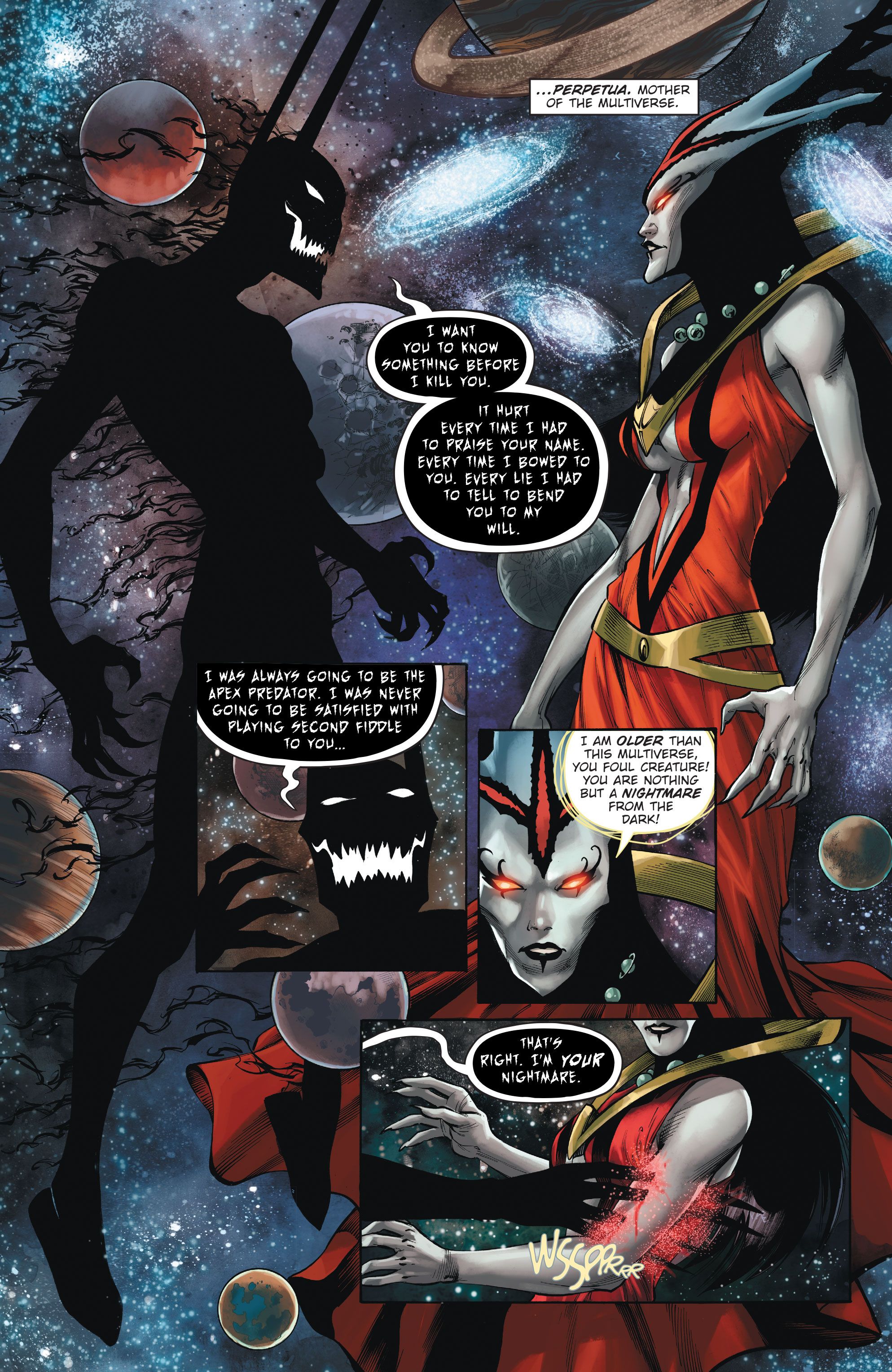 La nueva mejora cósmica del villano se explora en el especial Noches Oscuras: Death Metal - Rise of the New God #1, mientras el Caballero Oscuro se fija como objetivo traicionar a Perpetua para rehacer el Multiverso DC en su retorcida imagen. DC lanzó un avance de la historia principal, escrita por James Tynion IV, escrita por Jesús Merino, entintada por Vicente Cifuentes, coloreada por Ulises Arreola y escrita por Tom Napolitano. El avance es compartido, junto con la portada estándar ilustrada por Ian Bertram y coloreada por Dave Stewart, abajo.