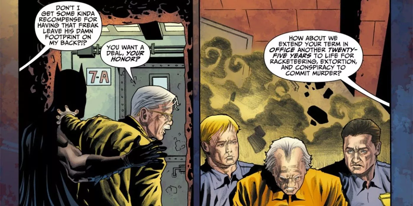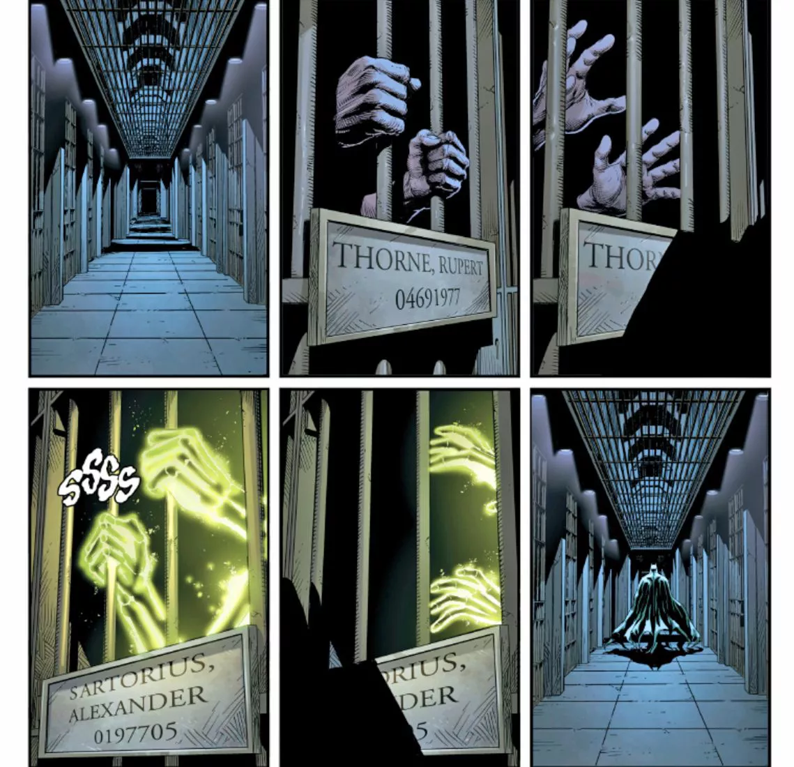 Así que mientras Batman caminaba silenciosamente por los bloques de celdas de Blackgate, los enemigos de siempre a quienes había encerrado observaban y luego retrocedían cuando pasaba por sus celdas, sabiendo lo que les esperaba si llamaban la atención del Caballero de la Oscuridad. Entre ellos estaba Rupert Thorne y el antiguo jefe del crimen trató de evitar la atención de Batman como todo el mundo.