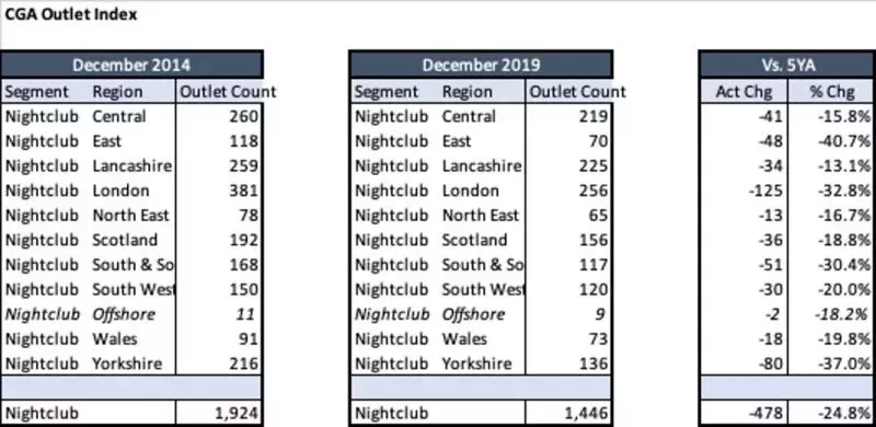 Los datos compartidos por la Asociación de Industrias Nocturnas (NTIA) a través de CGA muestran que una "tormenta perfecta" de problemas ha provocado un descenso drástico del número de clubes que operan en el Reino Unido. Ahora sólo quedan 1.130 clubes nocturnos.