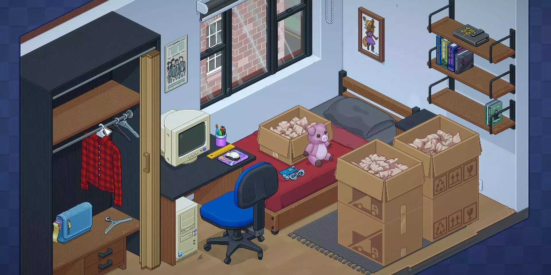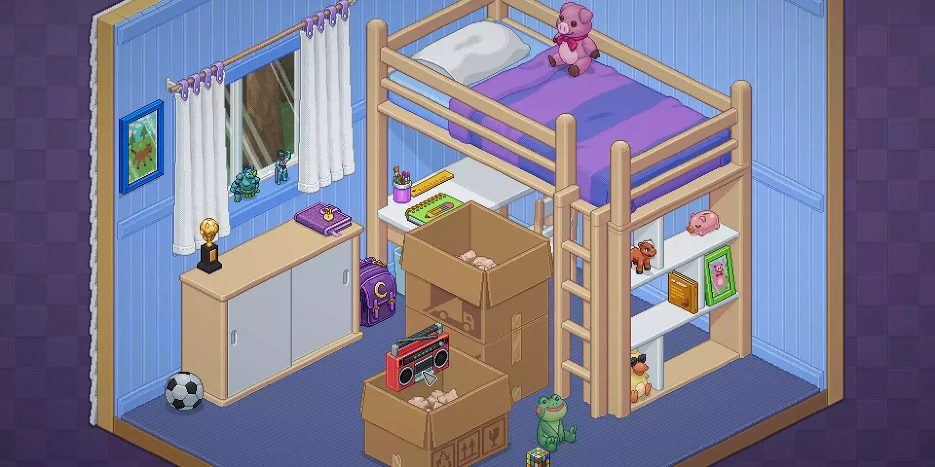 Este juego básico de organizar el desorden y crear orden a partir del caos es la mecánica principal de Unpacking, y sería suficientemente divertido por sí solo. Pero la mecánica de organización está integrada en una narrativa global, ya que el jugador desempaqueta un dormitorio, luego un dormitorio y después una serie de apartamentos. Los propios espacios cuentan una historia de madurez de las relaciones cambiantes, mientras que los objetos desempaquetados explican los intereses y las prioridades. Desempaquetar el material artístico le dice al jugador algo sobre el protagonista, y los espacios compartidos pasan de ser minimalistas y prístinos a estar encantadoramente desordenados con personalidad.
