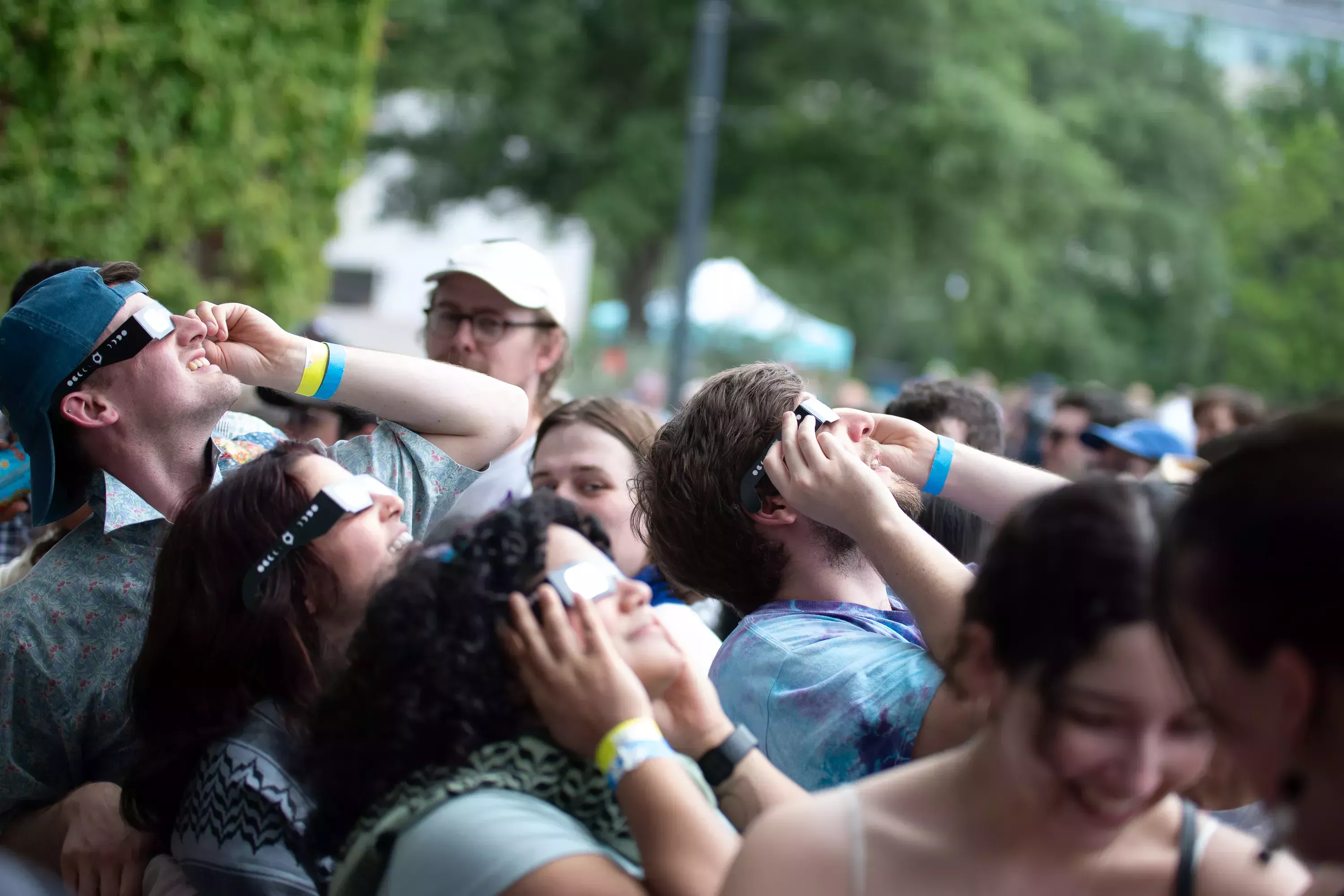 El concierto matinal de Vampire Weekend el lunes en Austin fue lo último en espectáculos para ADHD. ¿Querías ver a la banda, en su primer concierto tras año y medio de descanso y una ausencia mucho mayor en Estados Unidos? Eso era un acontecimiento en sí mismo, y una razón suficiente para que se agotaran las entradas del Moody Amphitheater, con capacidad para 5.000 personas. ¿O querías pasar gran parte del concierto mirando en dirección contraria y hacia el cielo? Normalmente esto sería una falta de etiqueta en los conciertos, o un motivo para sacar el spray nasal Narcan. Pero con un eclipse que se estaba produciendo gradualmente en el cielo del sureste, y las gafas de sol características de Vampire Weekend proporcionadas al entrar, nunca había habido mejor momento para dar la espalda a Ezra Koenig.