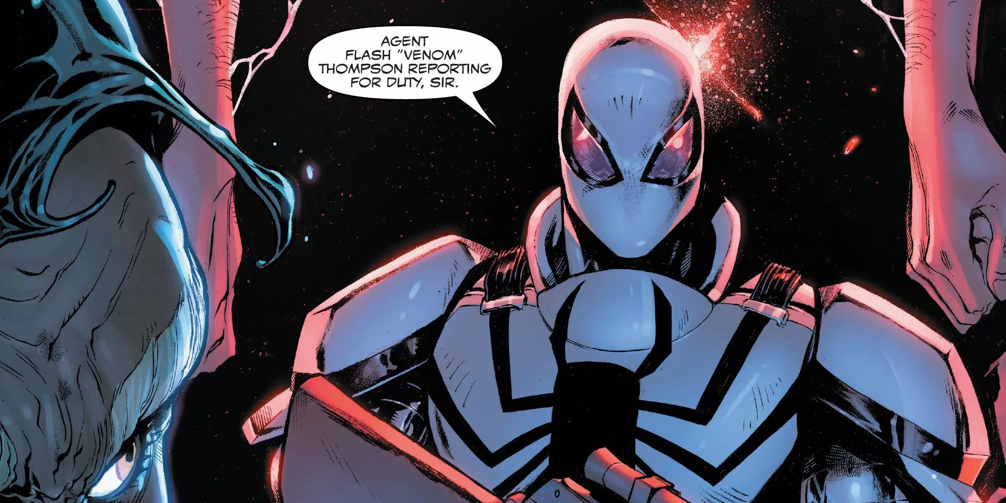 Afortunadamente, Rex no está solo. Revela que después de pasar un largo perÃodo de tiempo en la mente de la colmena, encontró otro aliado en Flash Thompson, alias Agente Anti-Veneno. Como Eddie y Rex, Flash estuvo unido a un simbionte por mucho tiempo, por lo que su códice está libre de la mente colmena. Puede que sólo sea un recuerdo de Flash Thompson, un eco, pero aún asà permite que el personaje vuelva y participe en la lucha contra el Rey de Negro. Ahora, Eddie, Rex y Flash forman un equipo mortal, con una misión en mente: derribar a su dios.