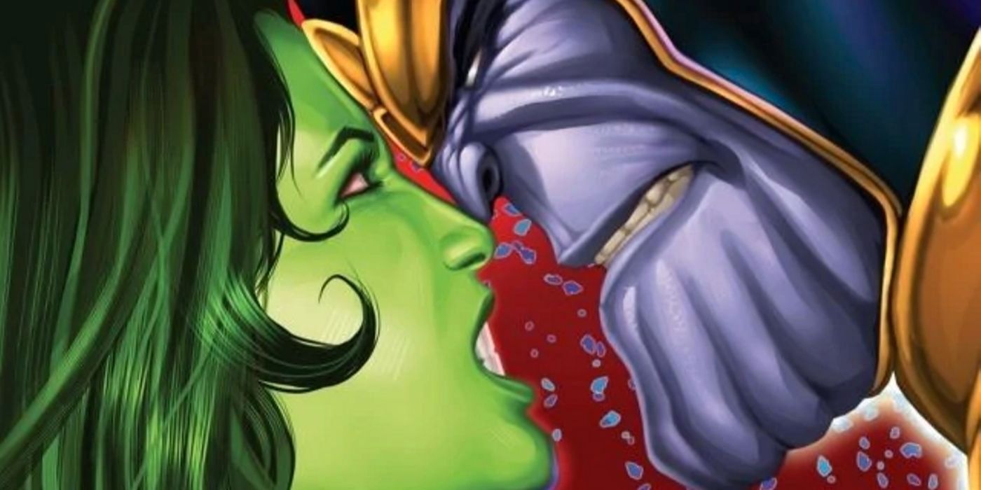 Pero ella no es rival para Thanos con el guante del infinito. Thanos toca a She-Hulk e inmediatamente es inundada por organismos marrones que la consumen o la asfixian, no está claro. Una cosa es segura: ella muere y horriblemente.