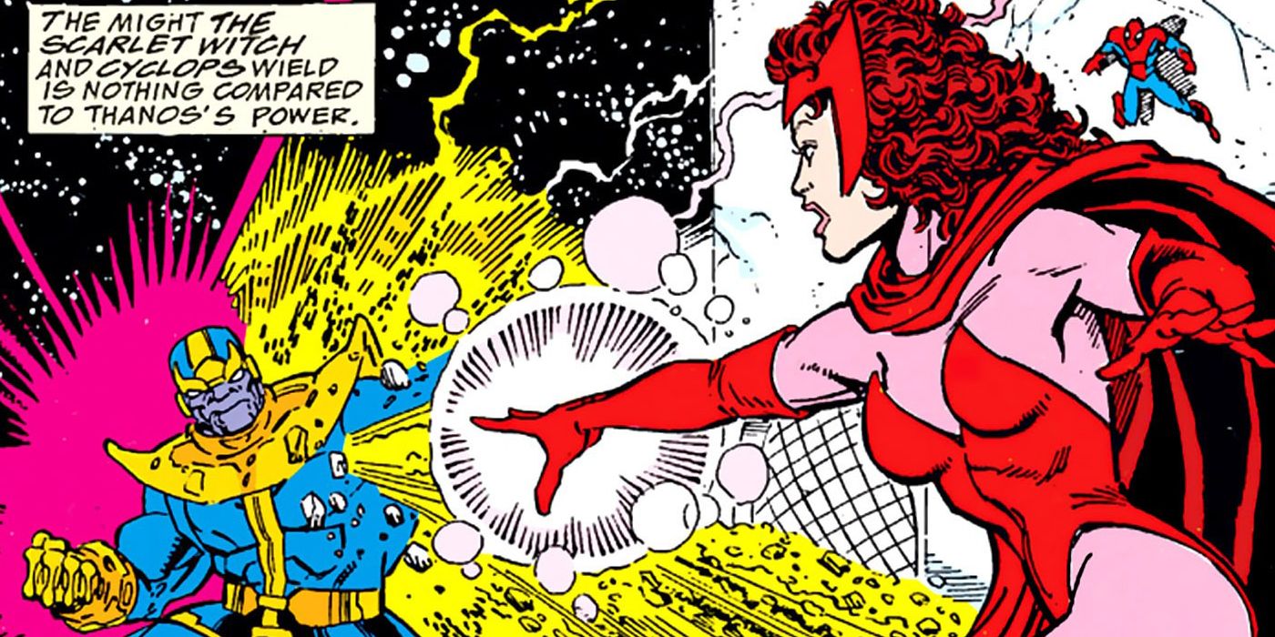 La Bruja Escarlata casi destruye a Thanos en Vengadores : Fin del juego. Tuvo menos éxito en los comics. Inmediatamente después de su heroico rescate de Thor, se enfrenta a Thanos con todo su poder. Mientras el cíclope intentaba distraer a Thanos, ella lo flanqueó con sus poderes hexagonales.
