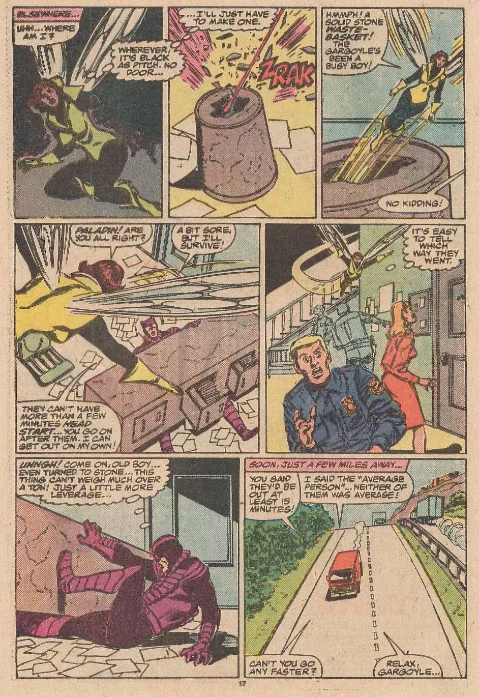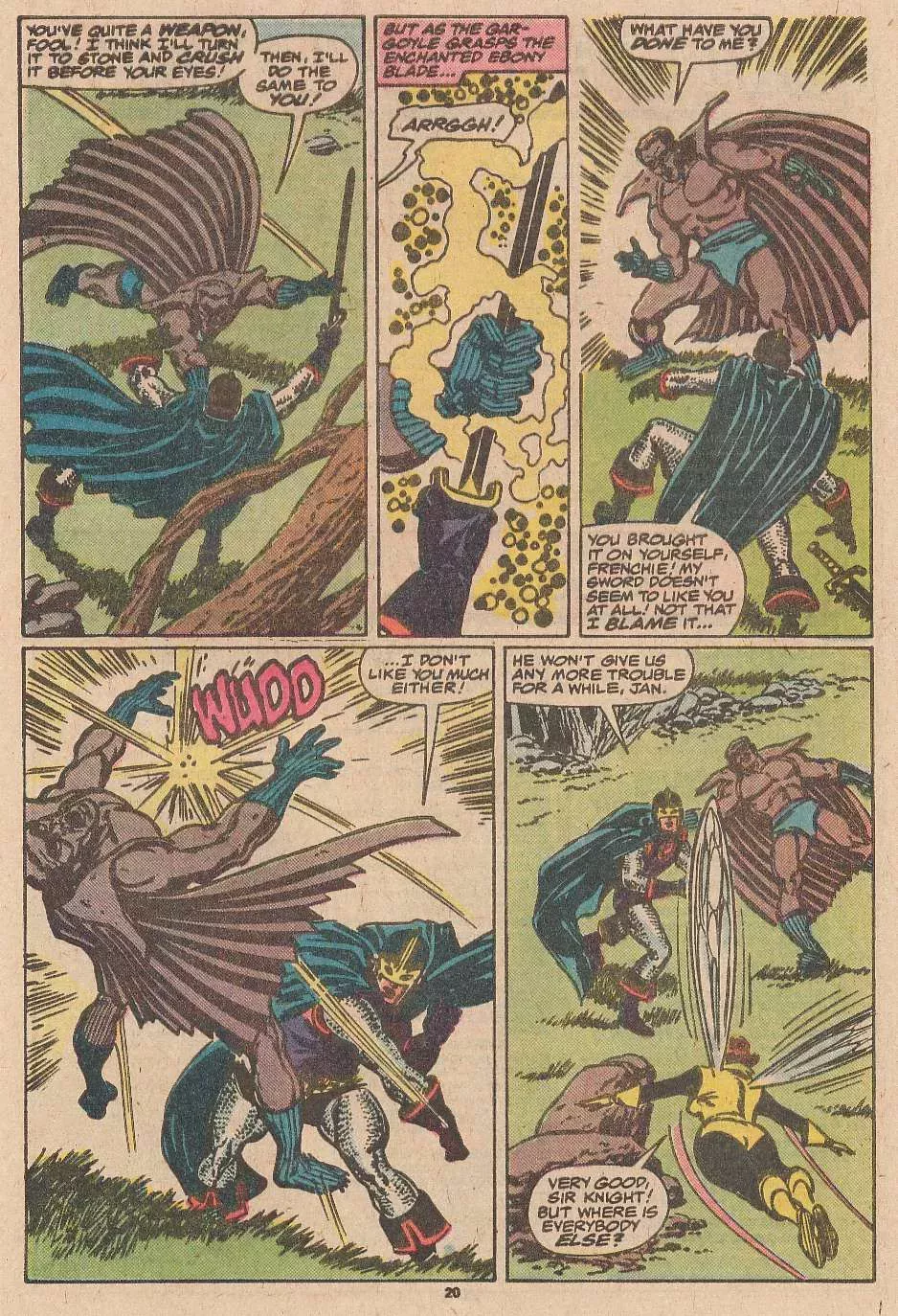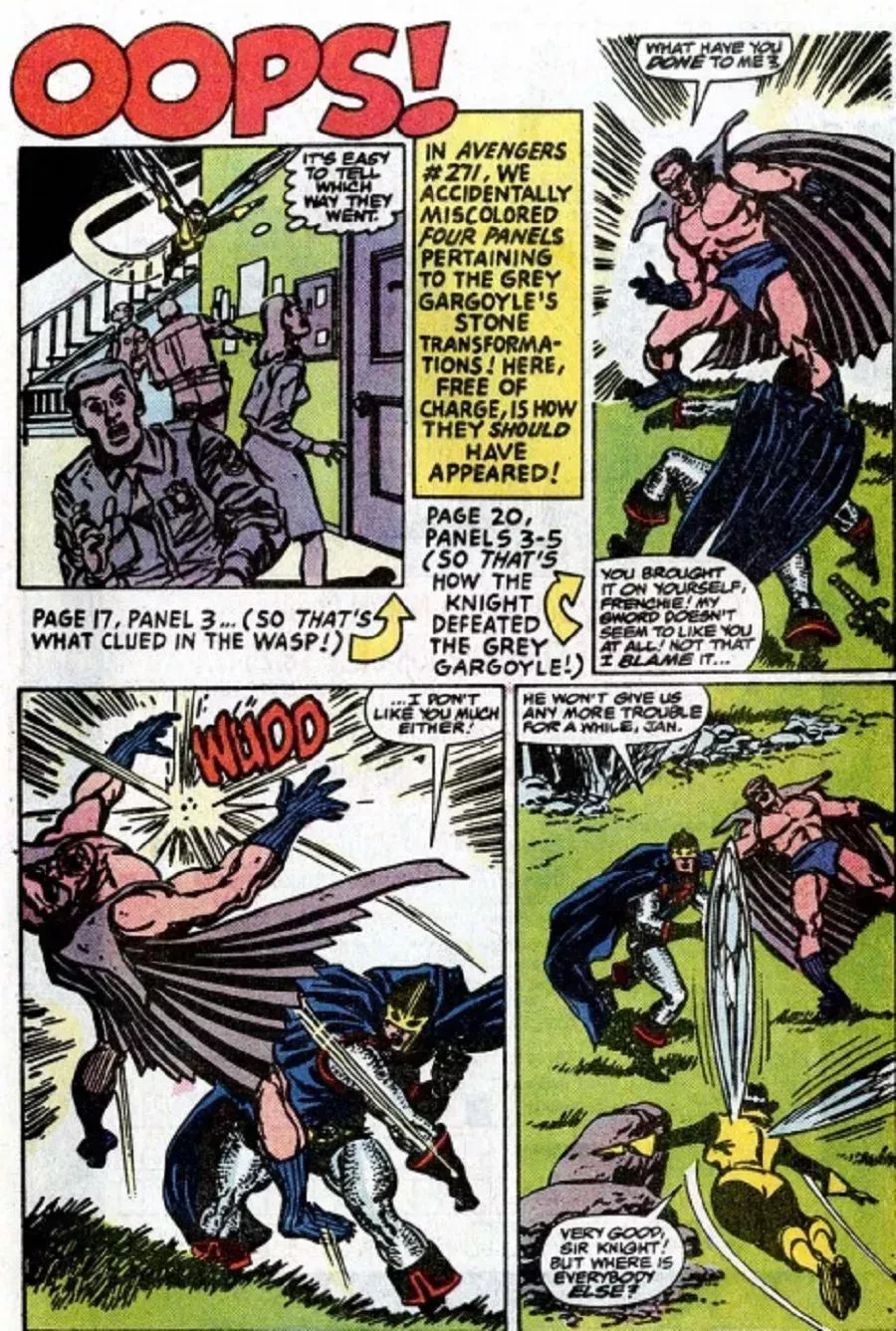 Pues bien, la columna de cartas del número 277 de los Vengadores (el final de la historia "Under Siege") reveló de qué se trataba. Resulta que el colorista se equivocó y se olvidó de colorear a las personas como estatuas al principio de la historia y TAMBIÉN se olvidó de mostrar que la espada del Caballero Negro tenía una especie de efecto de succión de poder en la Gárgola Gris, convirtiéndolo en humano y permitiendo que el Caballero Negro lo dejara inconsciente. Así que la columna de letras tenía paneles que se podían cortar y pegar y poner en las páginas del #271 para que esa historia tuviera ahora sentido...