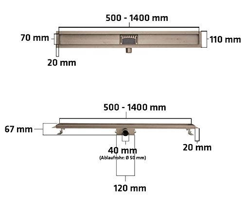 - DIMENSIONES: la canaleta de ducha tiene las siguientes medidas aproximadas: Largo: 500 - 1000 mm I Ancho del canal: 70 mm I Cavidad de las baldosas: 14 mm I Ancho del borde : 20 mm I Altura de instalación: 67 mm I Ancho del sifón: 120 mm.