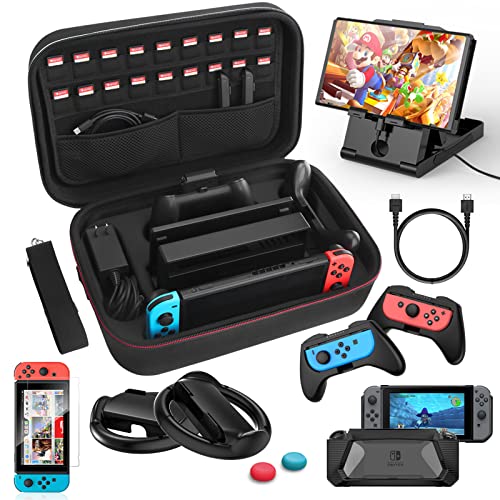 HEYSTOP 12 en 1 Kit de Accesorios Switch, con Funda de Transporte, TPU Cubierta Protectora, Grip y Volante, Soporte, Protector de Pantalla, Apretones de Pulgar, Cable USB, Negro