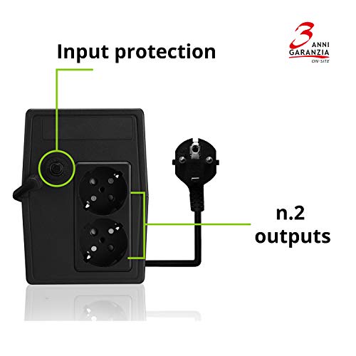 - Listo para Usar: a través de los 2 enchufes de salida Schuko y el cable largo de entrada con enchufe Schuko, cada persona puede instalar el SAI de forma segura y en menos de un minuto. Dimensiones totales: L 10 x P 14 x H 28 cm.
