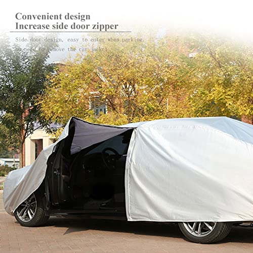 - CONSIDERAR EL DISEÑO: En la posición de conducción lateral, hay un diseño de cremallera en la cubierta del automóvil. Es conveniente que te subas al auto por si ya está cubierto. Entra y saca fácilmente sin quitar la funda. En la portada, también hay rayas alargadas reflectantes nocturnas. De esta manera, los transeúntes pueden ver fácilmente el contorno de su automóvil y evitar accidentes.