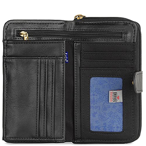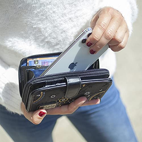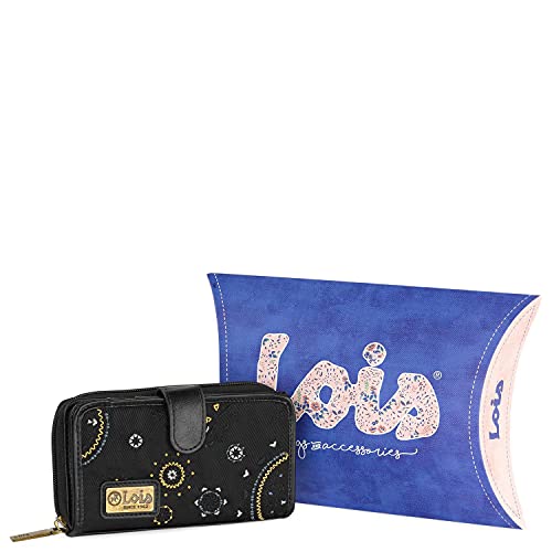 Lois - Cartera de Mujer Grande con Bordados y Motivos Mandala de Marca LOIS. Nylon y Cuero Vegano PU para Uso Diario con Cierre Cremallera y Botón. Protección Antiescaneo RFID 304416, Color Negro