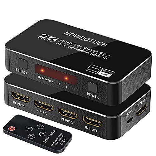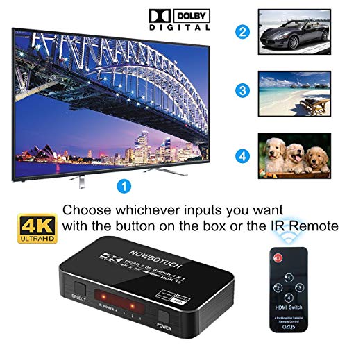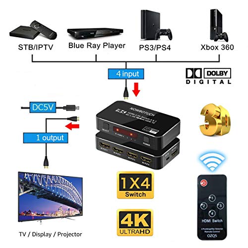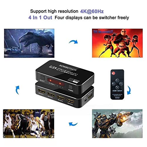 NOWBOTUCH 4x1 Divisor de Interruptor HDMI 4 Puertos 4Kx2K 60Hz 1080P, conmutador 3D HDMI 2.0 Selector HDMI 4 en 1 Salida con Control Remoto inalámbrico IR Compatible para PS3/PS4, Xbox 360/One, HDTV