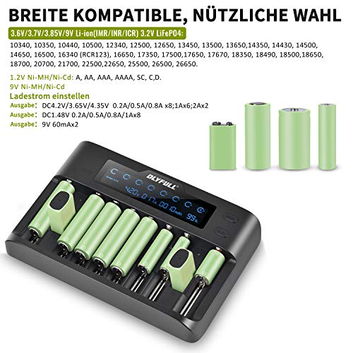 - 【Multifuncional】: es un cargador universal inteligente que puede cargar casi todas las baterías de 9 V, iones de litio, Ni-MH, NiCd. Puede detectar el tipo de batería y cargar automáticamente la batería bajo la corriente de carga elegida. Inserta la batería en cualquier canal y el cargador comenzará a reconocer los datos compatibles con la batería y mostrarlos en la pantalla LCD.