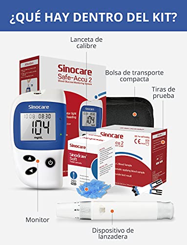 - ? Kit de glucosa en sangre: este kit incluye un medidor de glucosa en sangre sinocare Safe-Accu2 + tiras reactivas de glucosa en sangre x 50 + dispositivo de punción con 5 profundidades de penetración seleccionables + estuche + manual de instrucciones. Que satisface todas sus necesidades de control de glucosa en sangre.