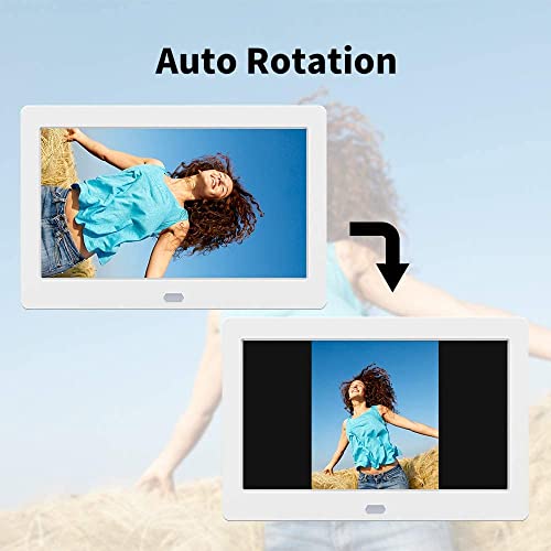 - ?️????????????́? ?? ???????? ???????????: una pantalla IPS de 7" de alta calidad con una resolución de 1024*600 y un ángulo de visión amplio de 178°, que evoca tus preciosos recuerdos. El brillo ajustable y la configuración de rotación automática garantizan una mejor experiencia de visualización. Puede colocar este marco en orientación vertical y horizontal, o incluso fijarlo a la pared.