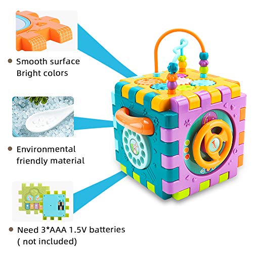 - No tóxico y seguro para los niños: este centro de actividades de cubo está hecho de material ABS, diseño de borde suave, seguro, no tóxico, mantiene a tus hijos seguros con el cubo de juego para niños pequeños y bebés que es útil e inofensivo. Nota: 3 pilas AAA no incluidas.