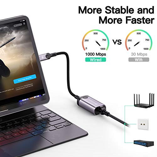 - 【Impresionante red de estabilidad】 En comparación con WIFI, este adaptador ethernet a usb c puede obtener una velocidad de red mucho más rápida y confiable, evitando eficientemente la caída de la conexión inalámbrica. Este adaptador ethernet a usb c es ideal para evitar interferencias inalámbricas y problemas de privacidad.