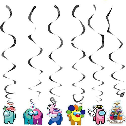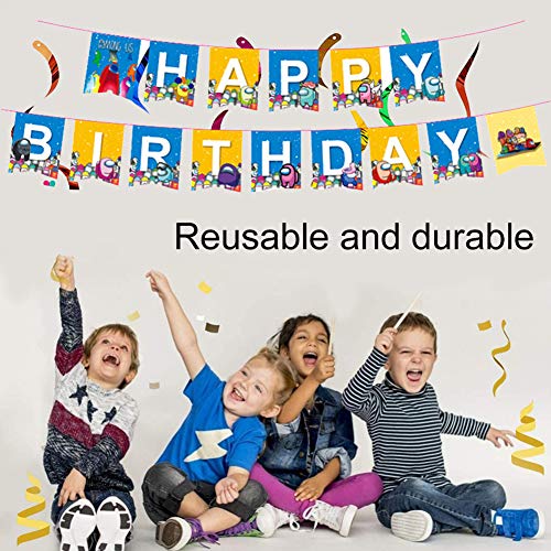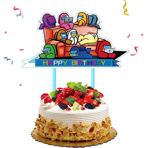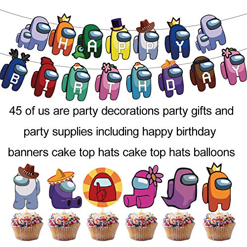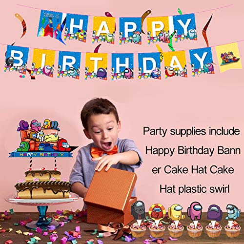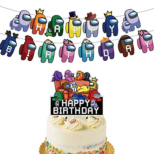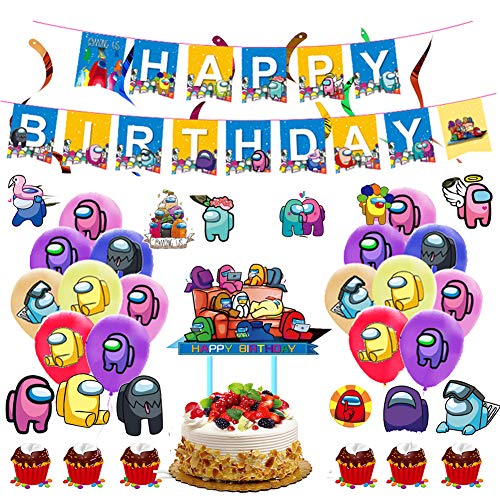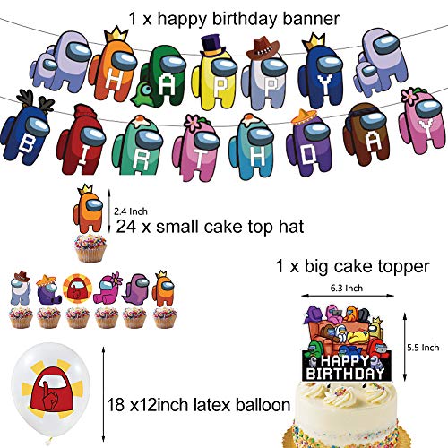 - ćAmong Us Party Decorations Package Includeć 1*happy birthday banner,1*big happy birthday cake topper, 12 * 12-inch latex balloons, 24*small cakecup topper, 6*hanging spiral decorations. Cartoon game theme backdrop, is very suitable for birthday party. Is the favorite decoration of kids.