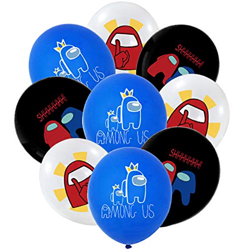 - ćAmong Us Party Decorations Package Includeć 1*happy birthday banner,1*big happy birthday cake topper, 18 * 12-inch latex balloons (6 black, 6 white, 6 blue), 24*small cakecup topper, 1 coil. Cartoon game theme backdrop, is very suitable for birthday party. Is the favorite decoration of kids.