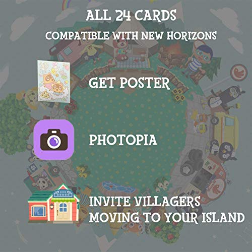 - Contenido: 1 caja transparente con un juego de 24 minitarjetas de juego para Amiibo Animal Crossing New Horizon y New Leaf. Permiten invitar a nuevos aldeanos a su isla, como los Amiibo.