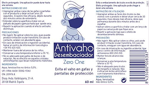 - MODE DE EMPLEO: Impregnar ambas caras de las gafas o pantallas con el producto y dejar actuar unos 20 segundos. Si quiere más eficacia, déjelo durante dos minutos antes de extenderlo. Extender sobre la superficie a tratar con un pañuelo de papel o gamuza hasta que quede seca. Repetir la aplicación cuando el efecto antivaho disminuya.