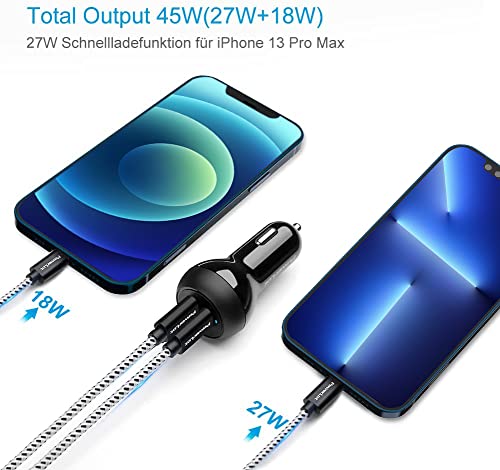- ❤ CARGADOR COCHE USB-C UNIVERSAL: Uno para todos. Con este cargador de encendedor de cigarrillos USB-C de 45 W con 2 puertos, puede cargar su computadora portátil / teléfono inteligente / tableta al mismo tiempo. Potencia total hasta 45W. ★ Salida USB C1: USB-C1: 5V/3A, 9V/3A, hasta 27W máximo, cargue sus computadoras portátiles, tabletas y teléfonos inteligentes. ★ Salida USB C2: 5V/3A, 9V/2A, máx. Hasta 18W, carga sus tabletas y teléfonos inteligentes.