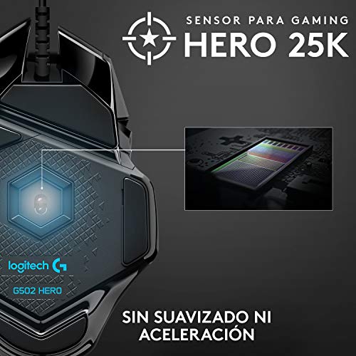 Logitech G502 HERO Ratón Gaming con Cable Alto Rendimiento, Captor HERO 25K, 25,600 DPI, RGB, Peso Personalizable, 11 Botones Programables, Memoria Integrada, PC/Mac - Negro