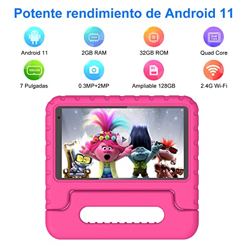 Kids Tablet 7 Pulgadas de Cuatro núcleos 1.6GHz Aocwei Android 11 HD Tableta para niños, 32GB (TF 128GB) | Wi-Fi | Cámaras duales | Control Parental | Estuche a Prueba de niños, Rosa roja