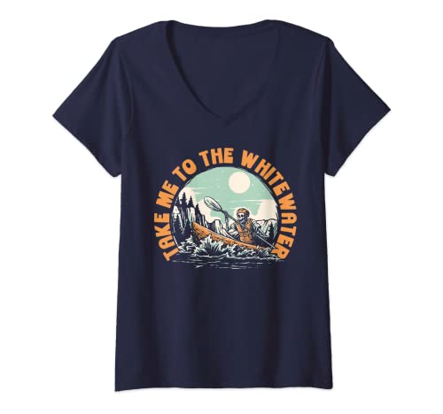 Mujer Take Me To The Whitewater Paddling Skeleton Kayak at Night Camiseta Cuello V
