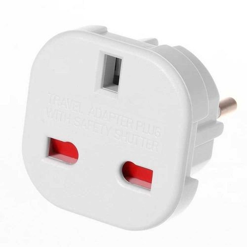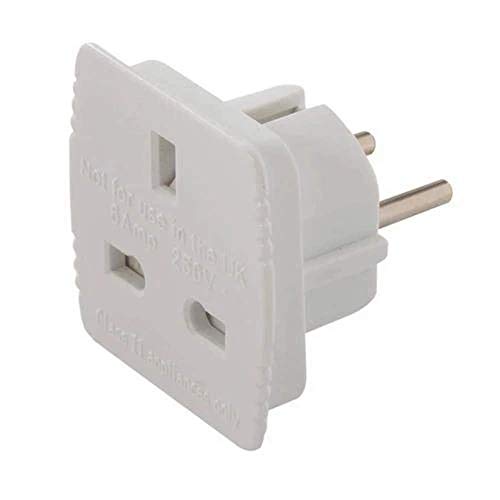 - Adaptador que permite usar los equipos eléctricos con sistema de conexión británico en países que usan tomas de corriente con sistema de conexión a tierra como DE, FR, BE, PL, NL, ES, PT, SE, FI, NO, GR, TR, AT ...