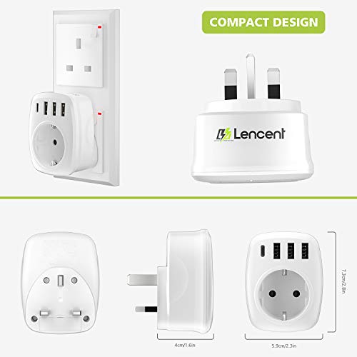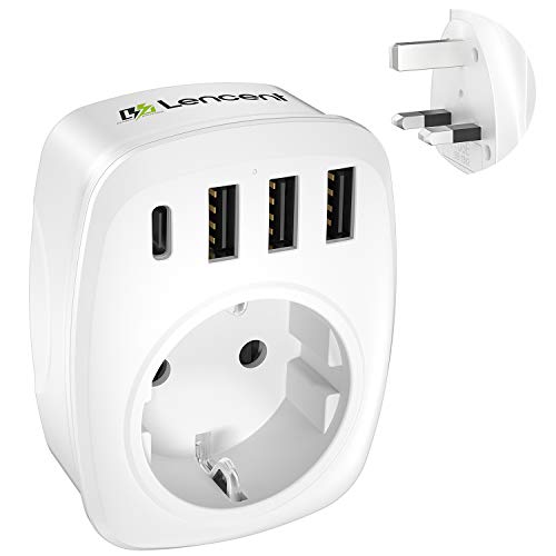 LENCENT Adaptador Enchufe UK, Adaptador de Viaje del Inglaterra [3 Puertos USB+1 Tipo C], Europa español 2-Pin a 3-Pin GB Gran Bretaña para Escocia, Irlanda, Gales, Maldivas, Gran Bretaña (Tipo G)