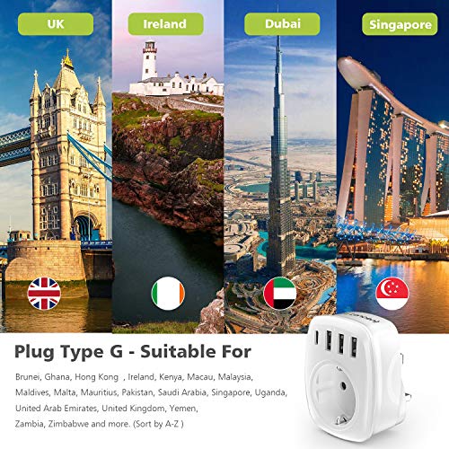 - Adaptador de enchufe tipo G – Compatible en la mayoría de países extranjeros como Reino Unido, Irlanda, Dubai, Maldivas, Malasia, Singapur, Pakistán, Zambia, Uganda, Brunei, Ghana, Hong Kong, Kenia, Macao, Mauricio, Arabia Saudita, Emiratos Árabes Unidos, Yemen, Zimbabwe y más.