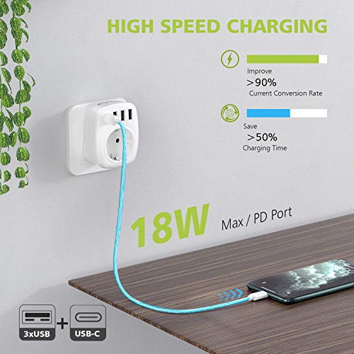 - Adaptador de viaje 5 en 1 – 1 enchufe CA (Schuko europeo de 2-pin) + 1 puerto tipo C + 3 puertos USB simultáneamente cargando 5 dispositivos con alta velocidad. USB de 2.4A es compatible para teléfono inteligente, Tipo C de 3.0A es compatible para Macbook, laptop y otros dispositivos.