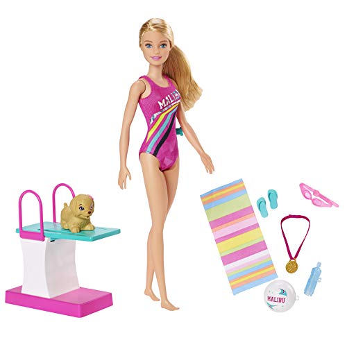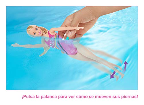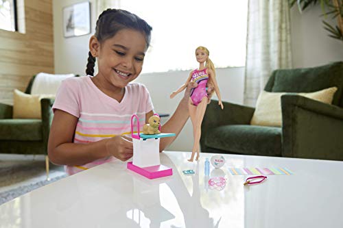 - MuƱeca nada y bucea de barbie dreamhouse adventures, 29 cm, con baƱador, y accesorio para nadar, trampolĆn y cachorrito