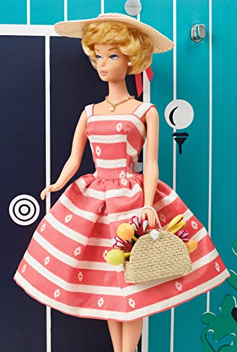 - Para un look fresco durante el dĆa, viste a la muƱeca Barbie con su vestido de tirantes del conjunto Busy Morning de 1963, con sandalias blancas de tacón, pamela y bolso de mimbre para la compra