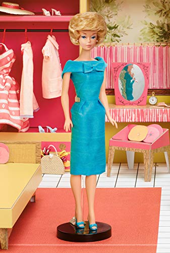 - Para disfrutar con los amigos, la muƱeca Barbie viste su clƔsico vestido entallado de seda de 1962, en color turquesa y con sandalias a juego.