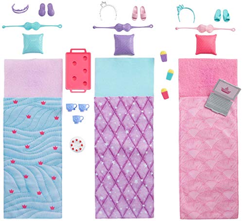 - Cada amiga tiene su propio saco de dormir con un elegante estampado en tonos pastel y un accesorio de almohada a juego: mete a las muñecas en sus sacos para que duerman.